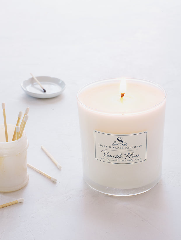 Vanilla Fleur is a sultry, warm scent with unexpected notes of sandalwood, amber, musk, and bergamot. Made in the USA with pure soy wax and cotton wicks for a clean burn and lasting fragrance. Each batch is carefully tested for optimal wick performance, fragrance throw, and burn time. Burn time up to 65 hours.